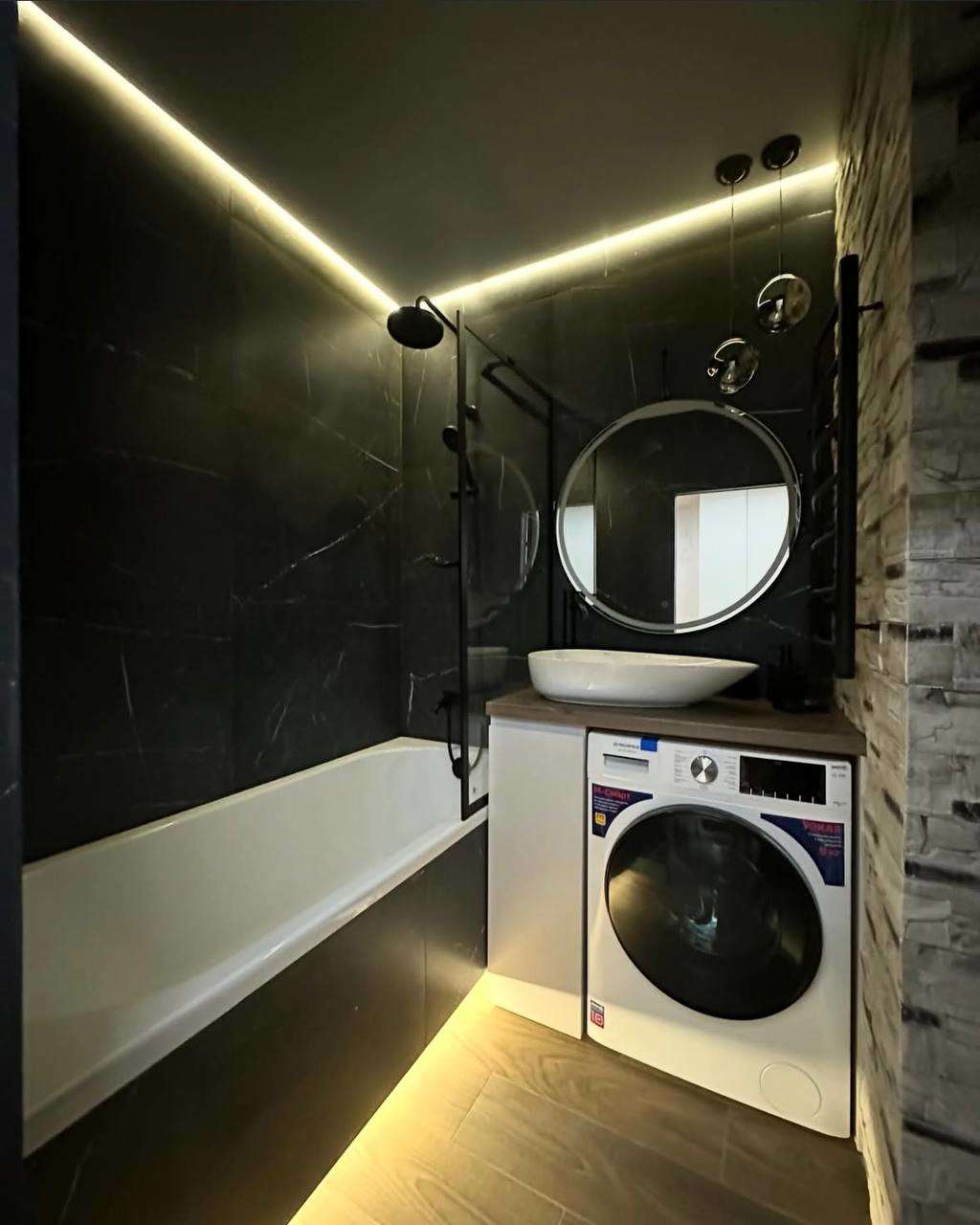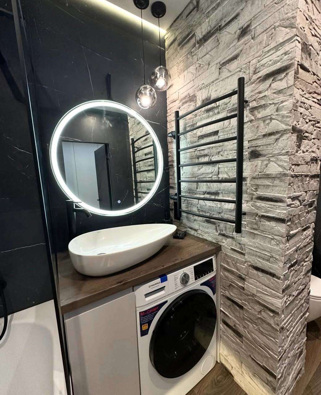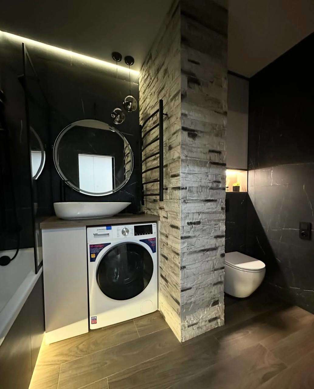 - Санузел отделан плиткой с имитацией камня, установлена современная сантехника, стиральная машина встроена в мебель.