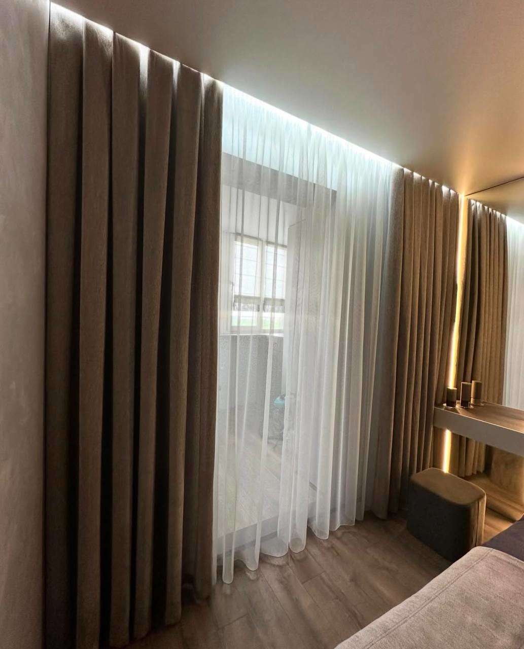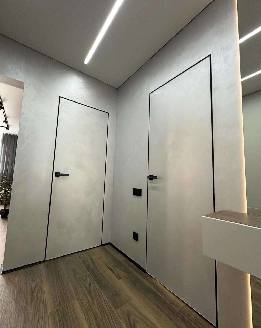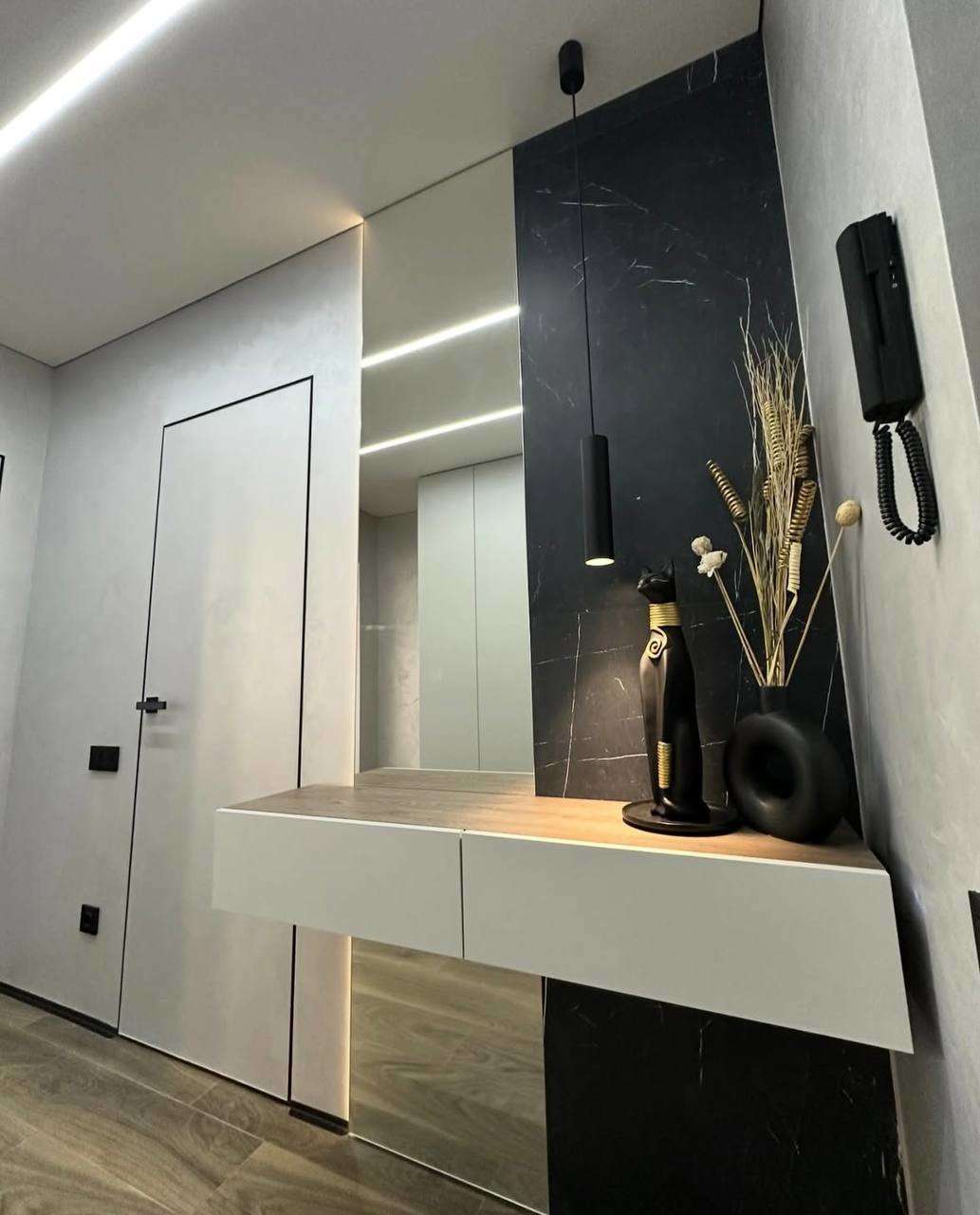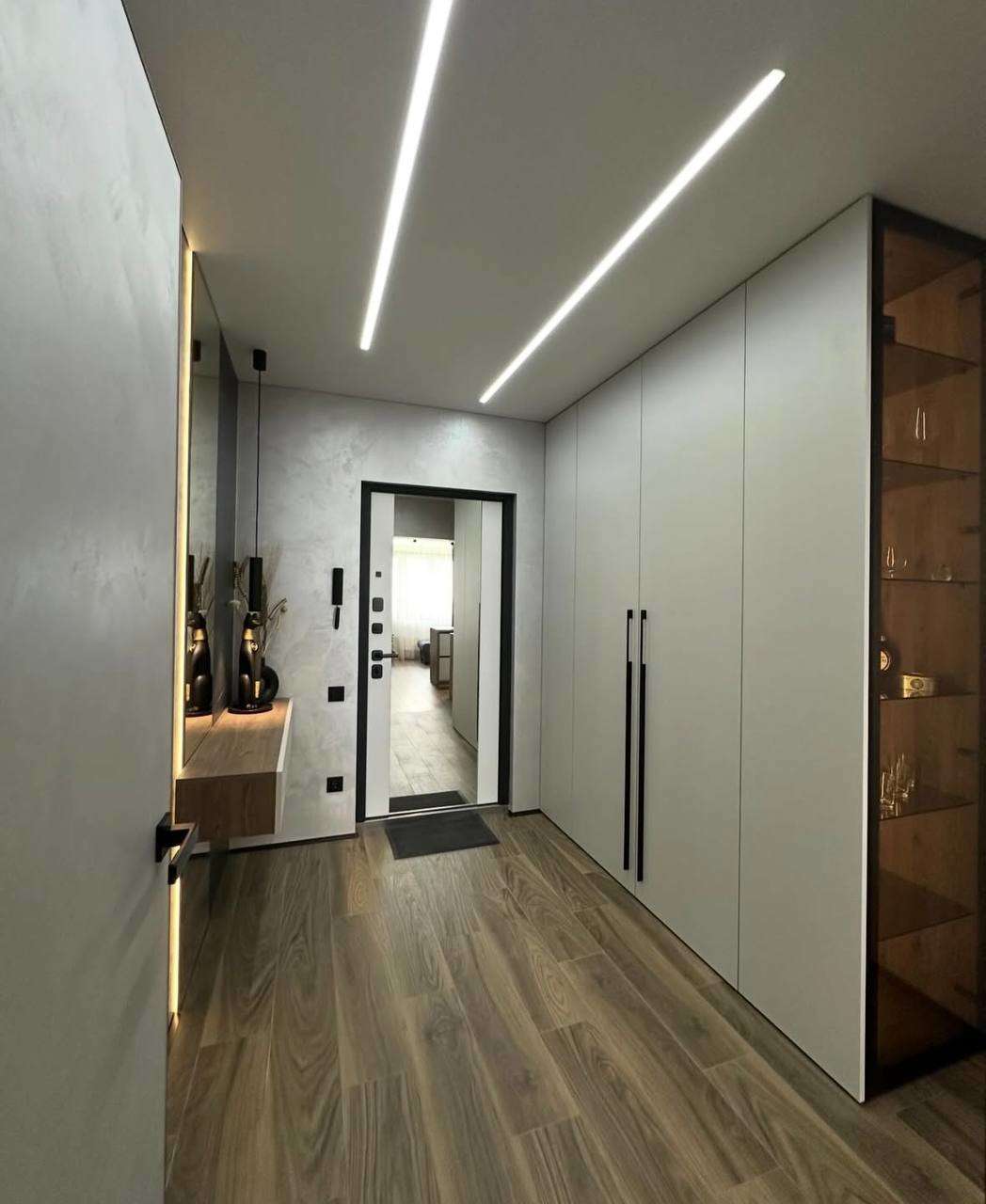 - Потолок — натяжной с встроенной точечной и линейной LED-подсветкой.