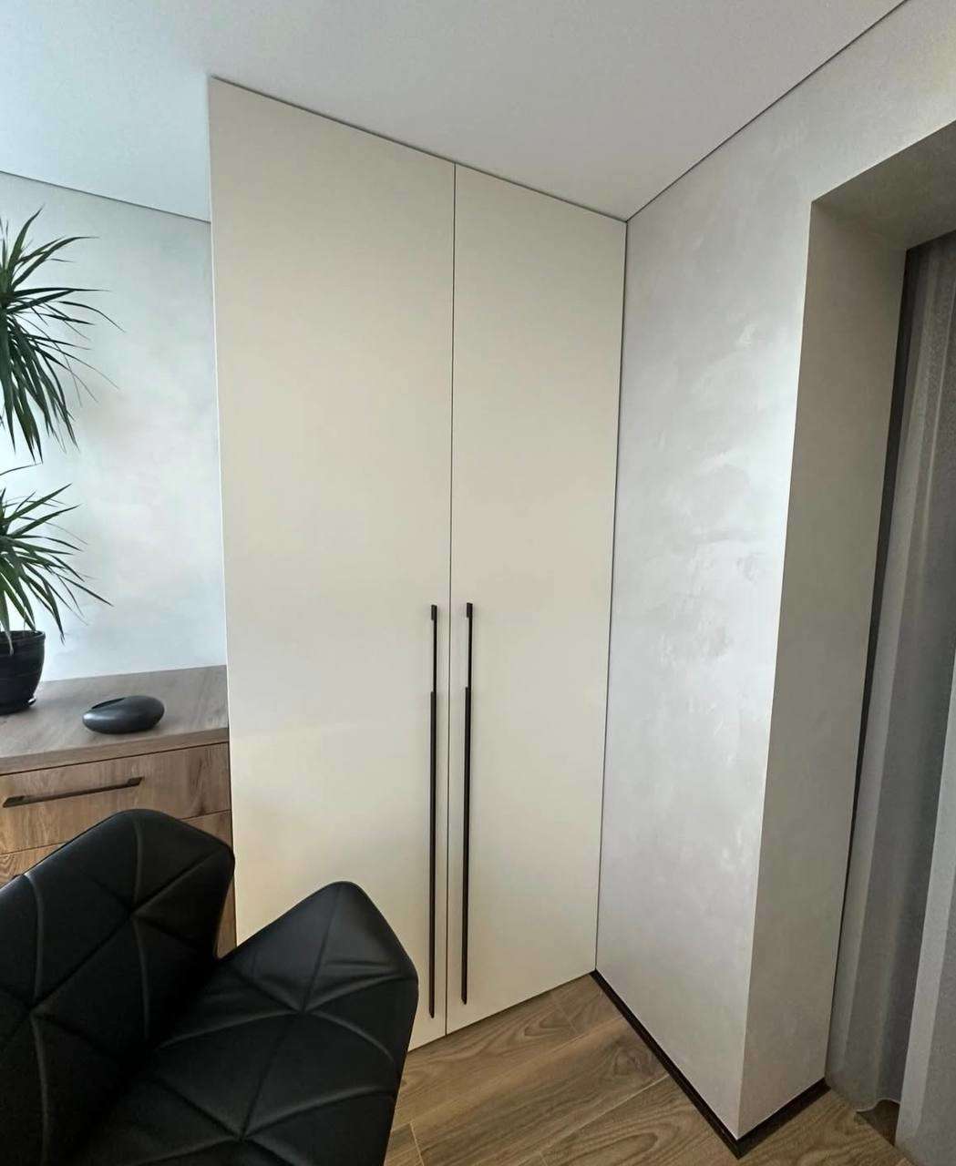 - В прихожей и гостиной встроенные шкафы с глянцевыми фасадами.