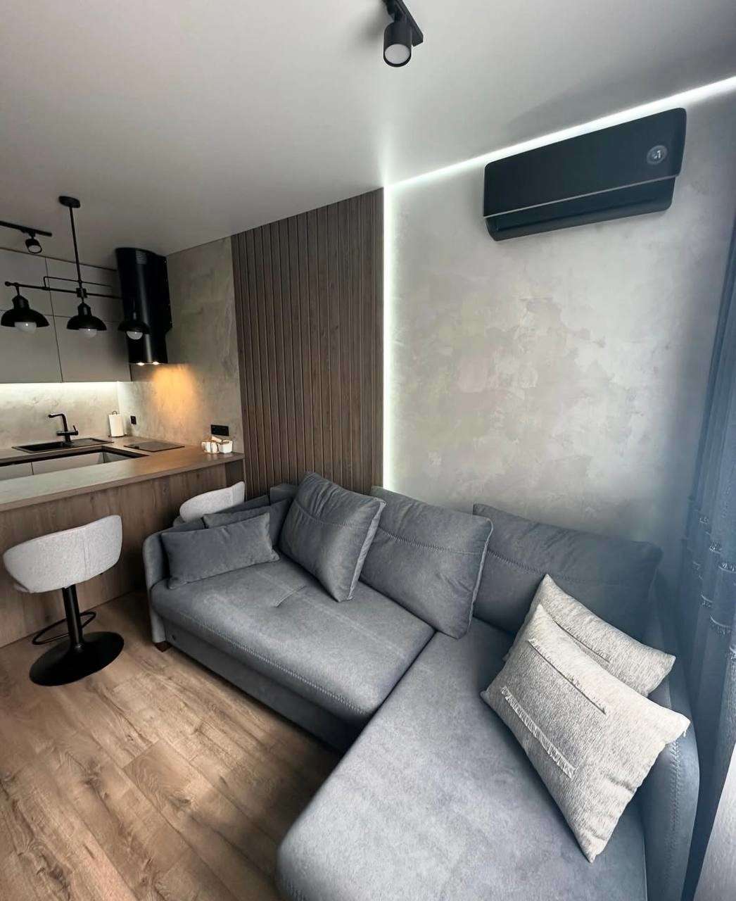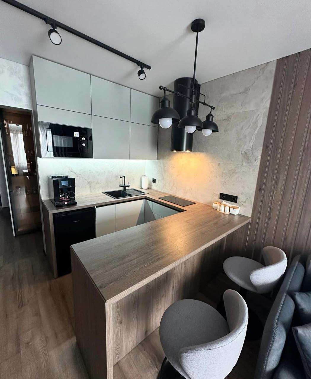 - Кухня оборудована встроенной техникой и имеет современный дизайн с барной стойкой.