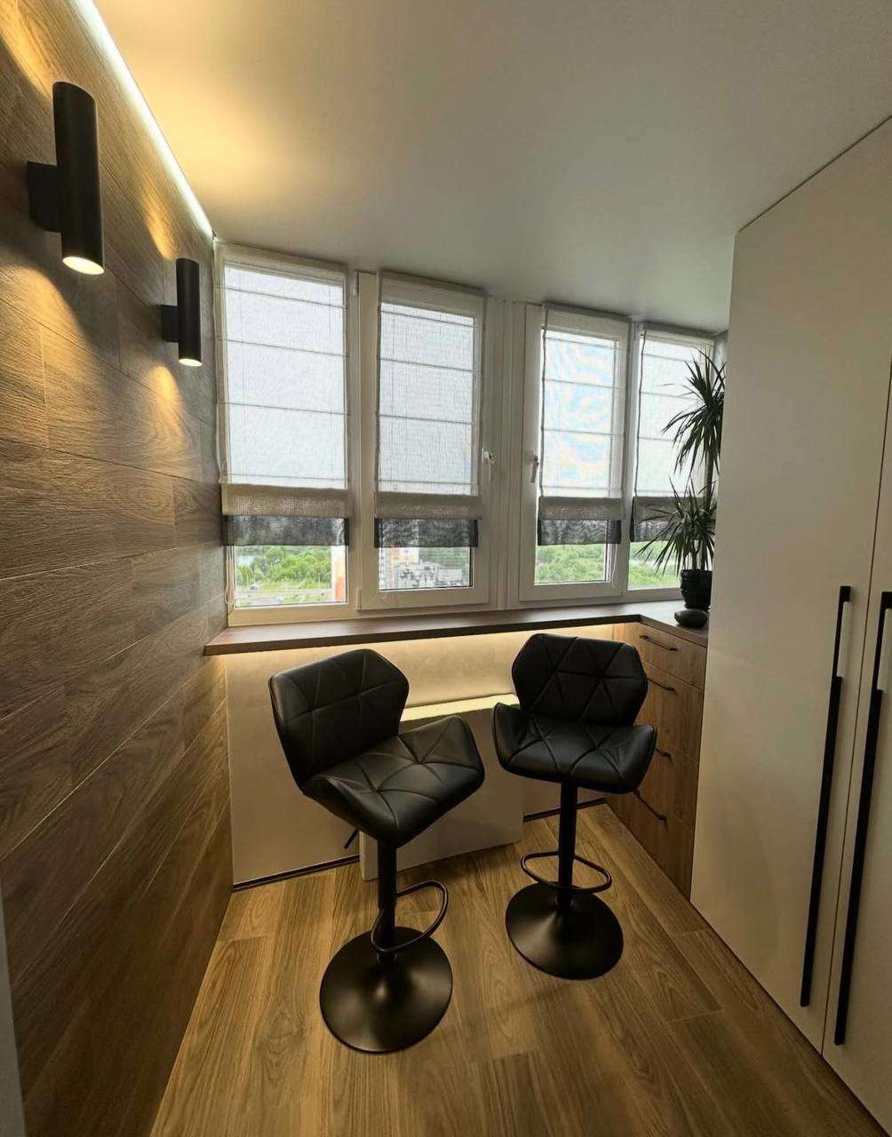 - Балкон (лоджия) утеплен и оборудован зоной отдыха с барными стульями.