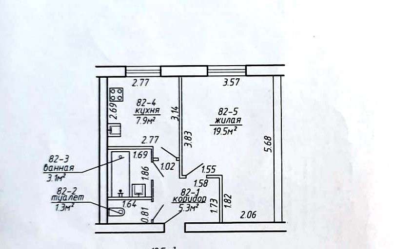 Общая площадь 37,1м2, жилая 19,5 м2, кухня 7,9м2.