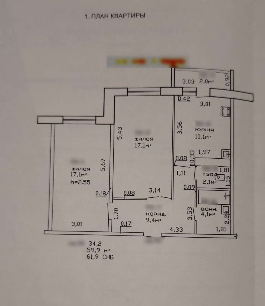 Общая площадь 59,9 м2, жилая площадь 34,2, м2, кухня 10,1 м2. Квартира с хорошей планировкой: комнаты все изолированные, большая кухня, раздельный санузел.