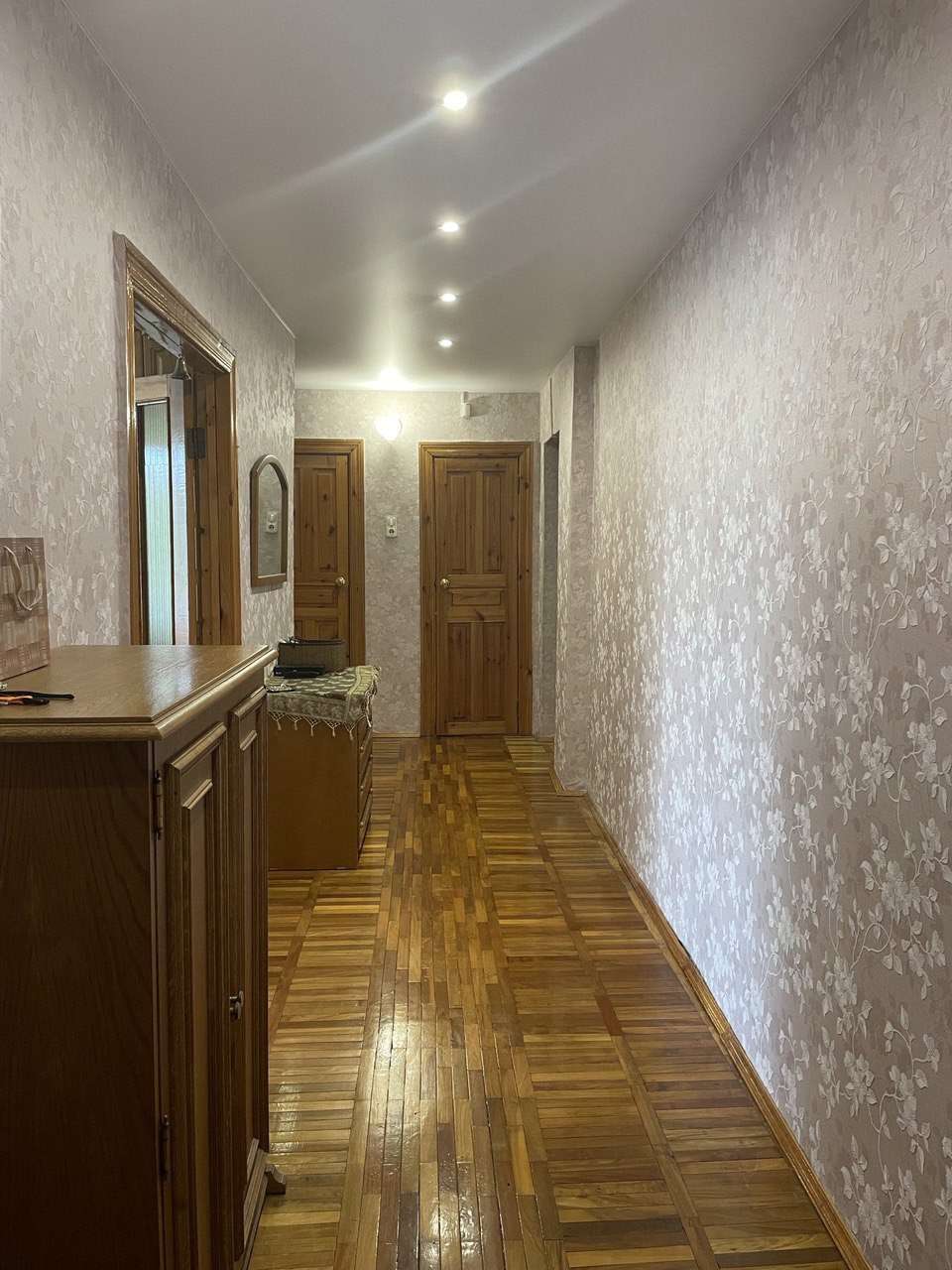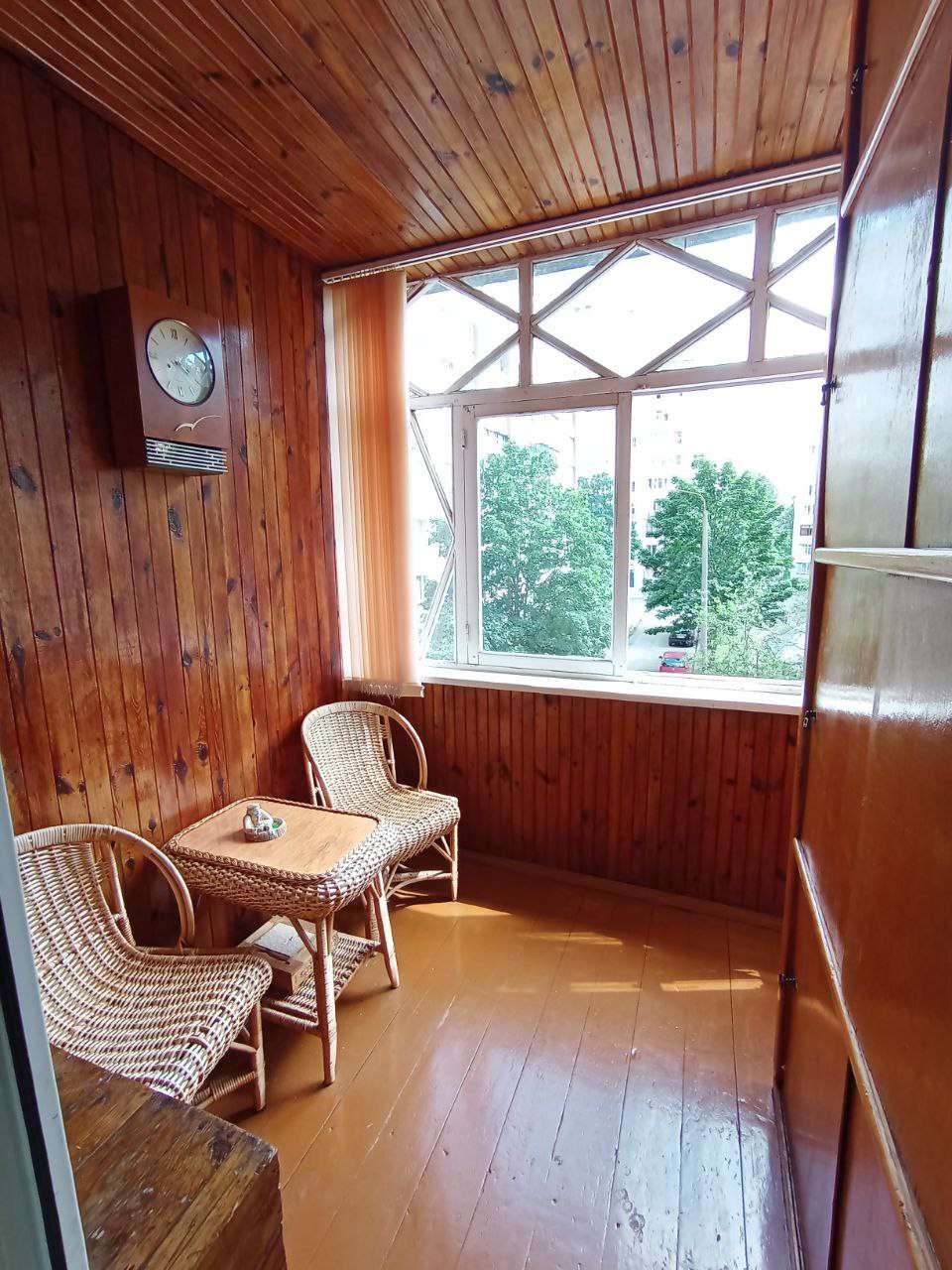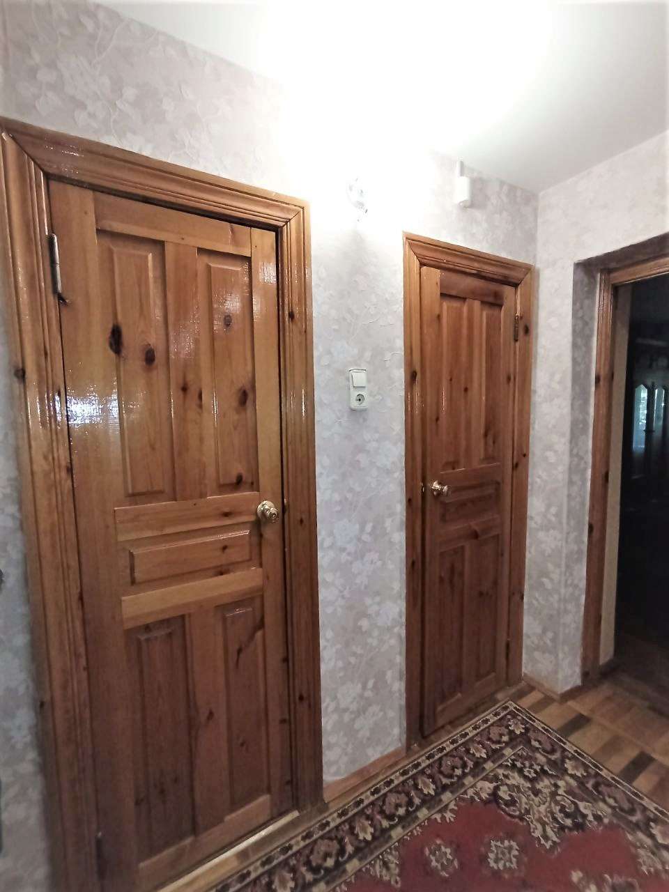 Двери выполнены из массива, все окна - производства ПВХ Becker system, на полу в комнатах и коридоре - ухоженный паркет, на кухне - ламинат, на полу в санузле и ванной комнате - плитка, балконы обшиты вагонкой. Удобно и практично оформлен тамбур.