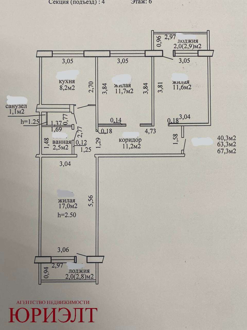 Технические характеристики квартиры: площадь по СНБ (включая две лоджии)-67,3 кв.м., общая 63,3 кв.м., жилая-40,3 кв.м., кухня-8,2 кв.м. Все комнаты изолированные, санузел раздельный, 2 лоджии из жилых комнат. Высота потолка-2,5 метра.