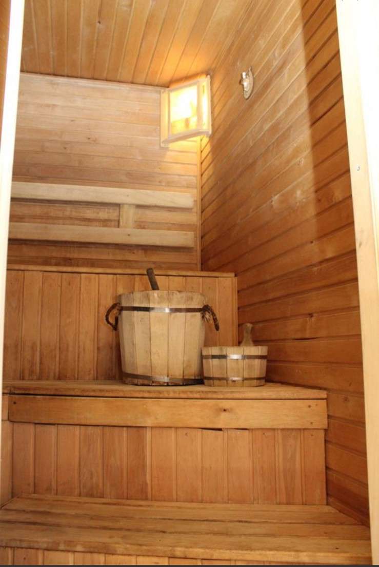 Отдельного внимания заслуживает баня на дровах со специальной печью из камня талькохлорита с панорамным стеклом, выходящим в гостиную.
