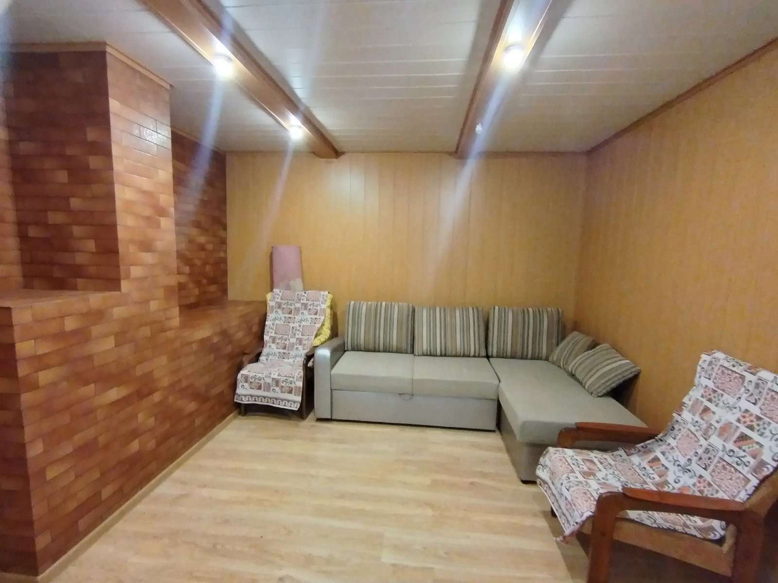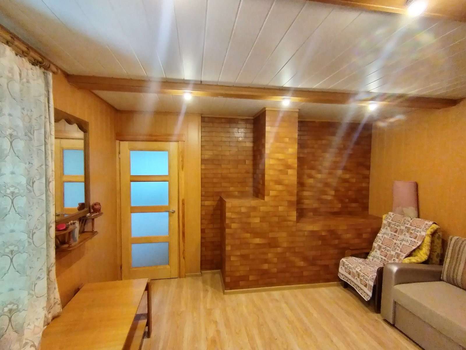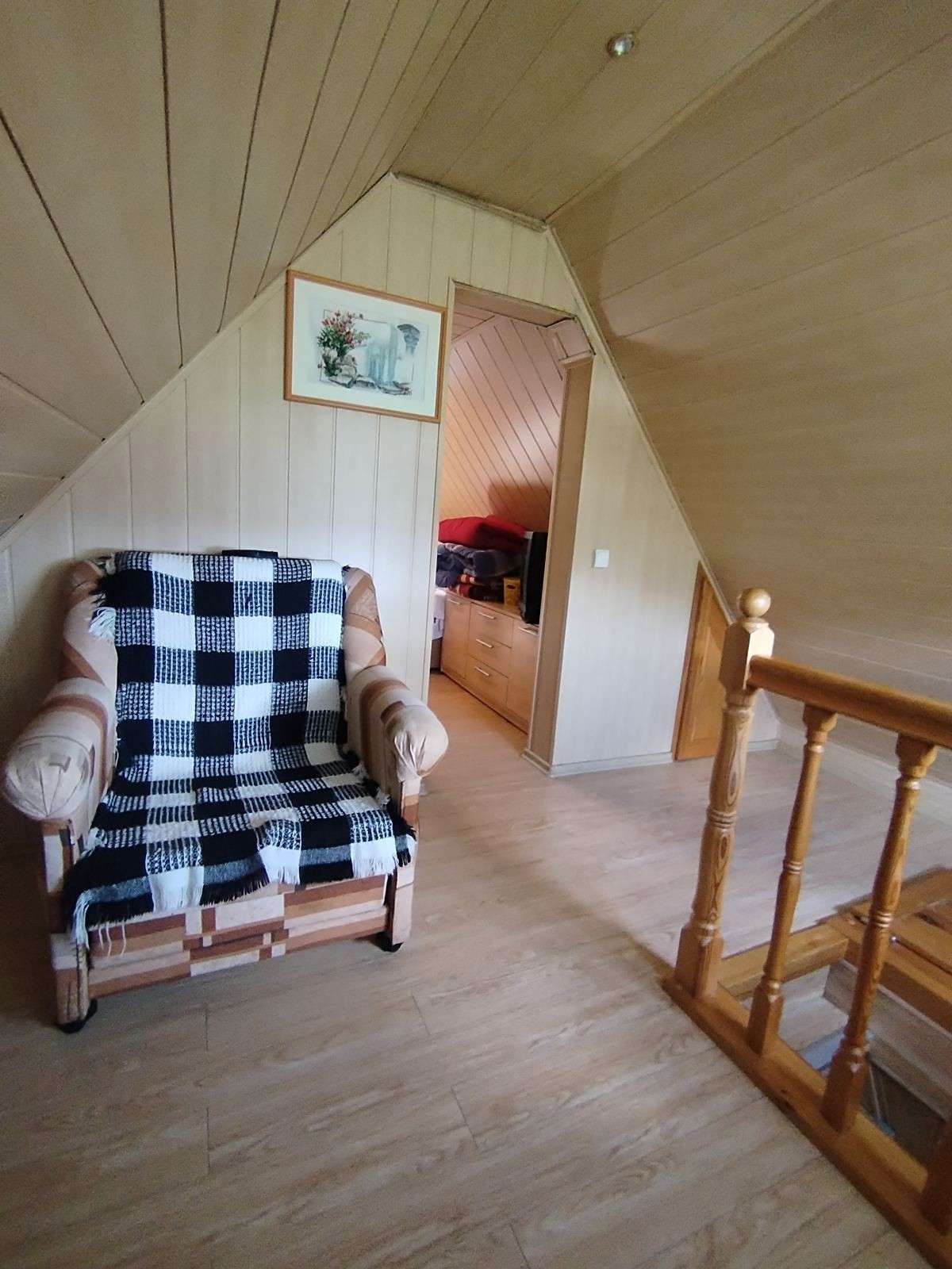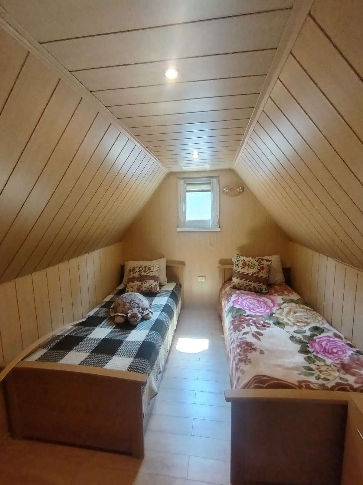 * Внутри дома: Просторная гостиная с удобным угловым диваном и креслами, уютная кухня, на мансардном этаже несколько спальных мест.