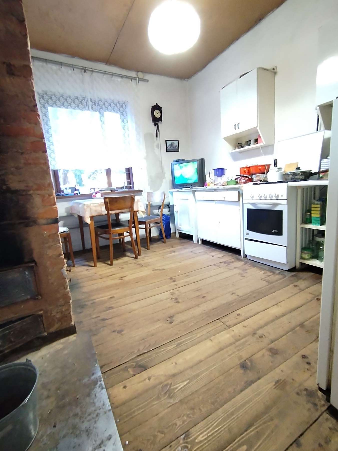 На первом этаже гостиная 21,1м2 с камином, кухня 11,2м2, жилая комната 13,8м2. Высокие потолки 3м. Также находится совместный санузел и котельная. Есть действующая печь.