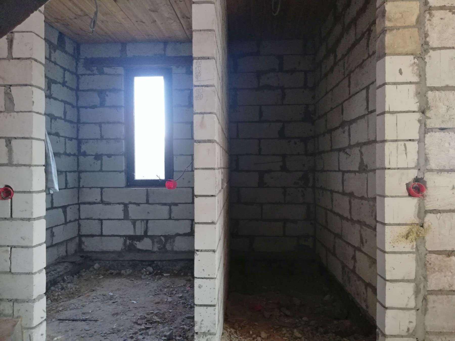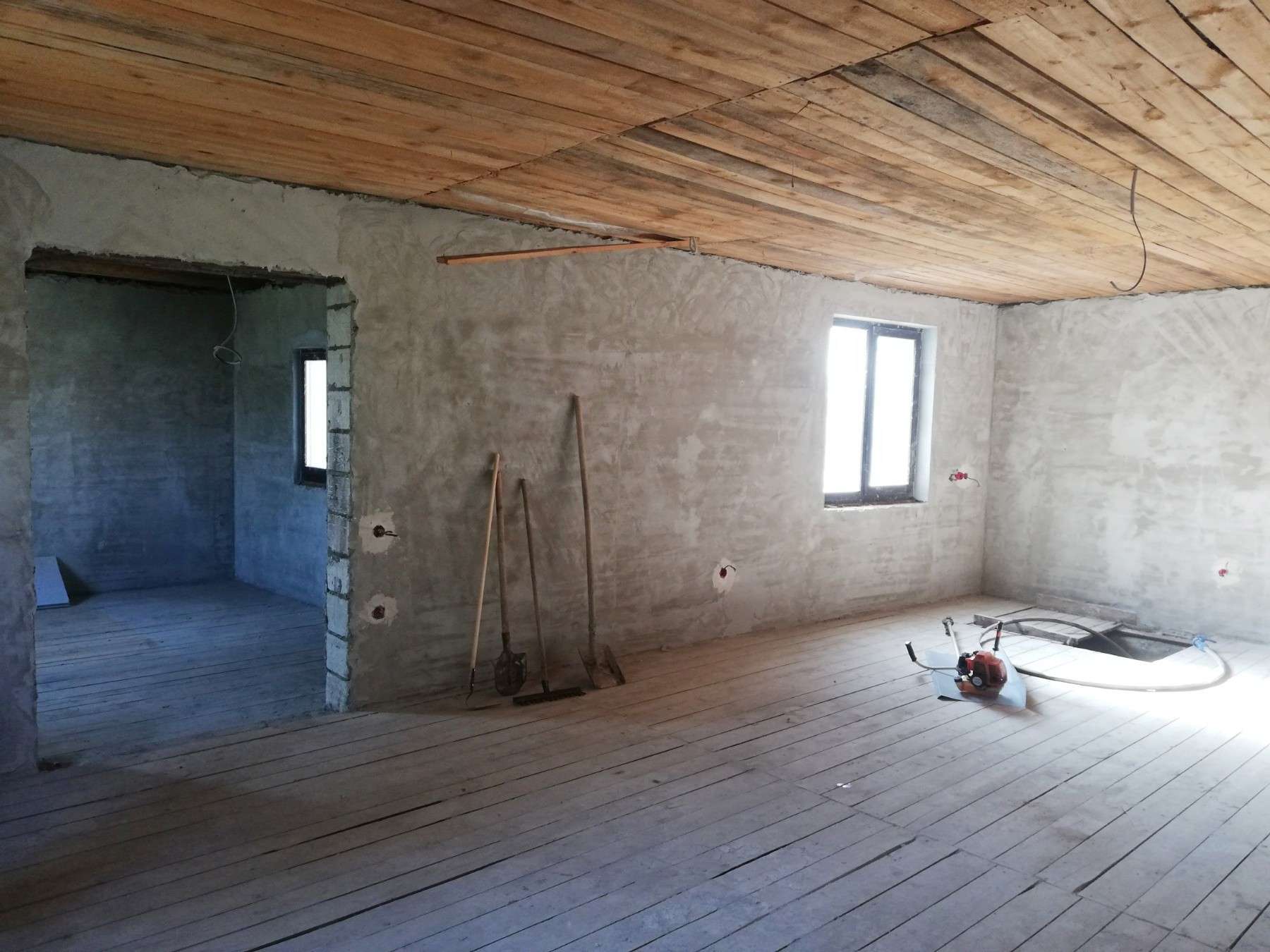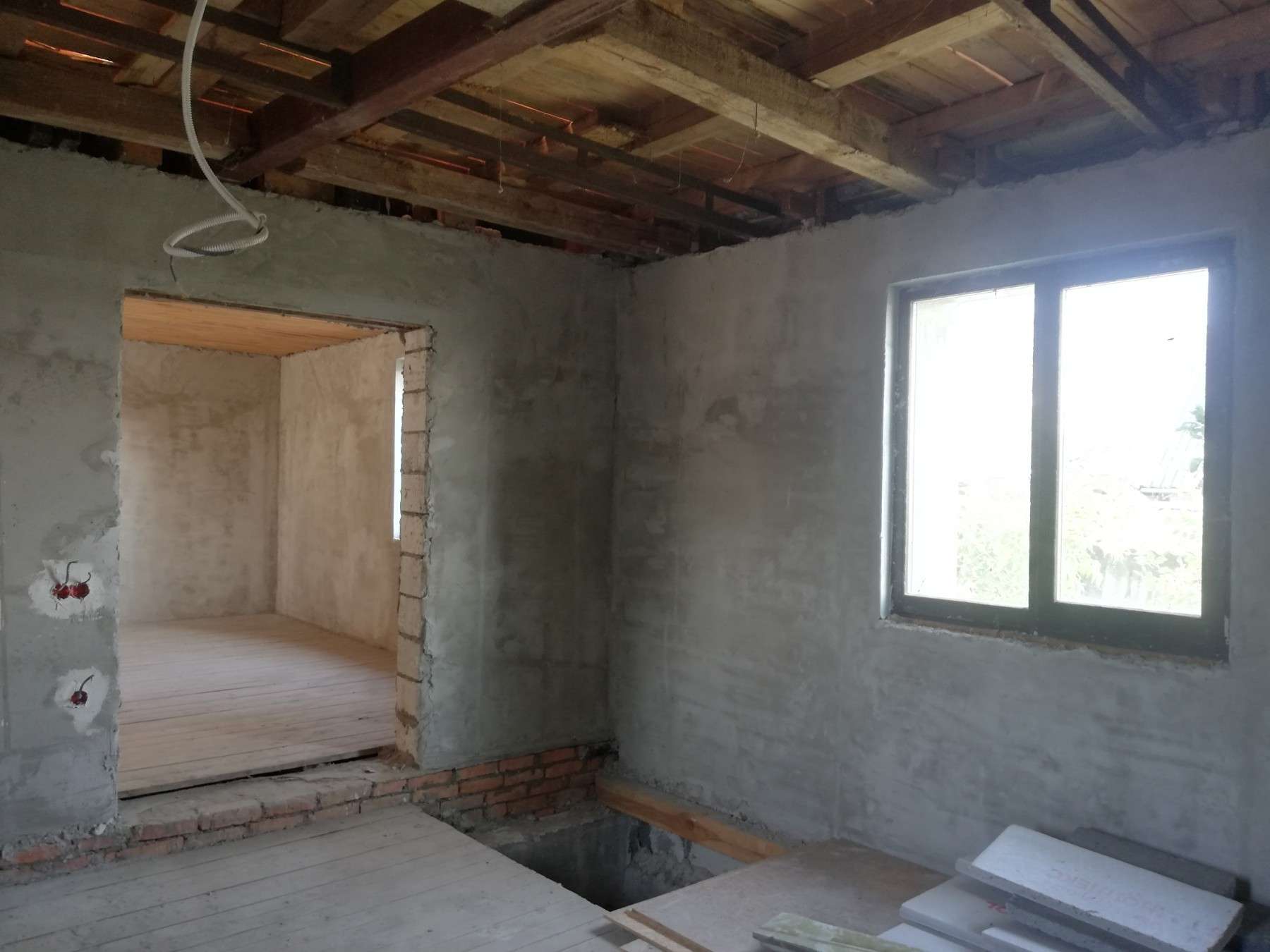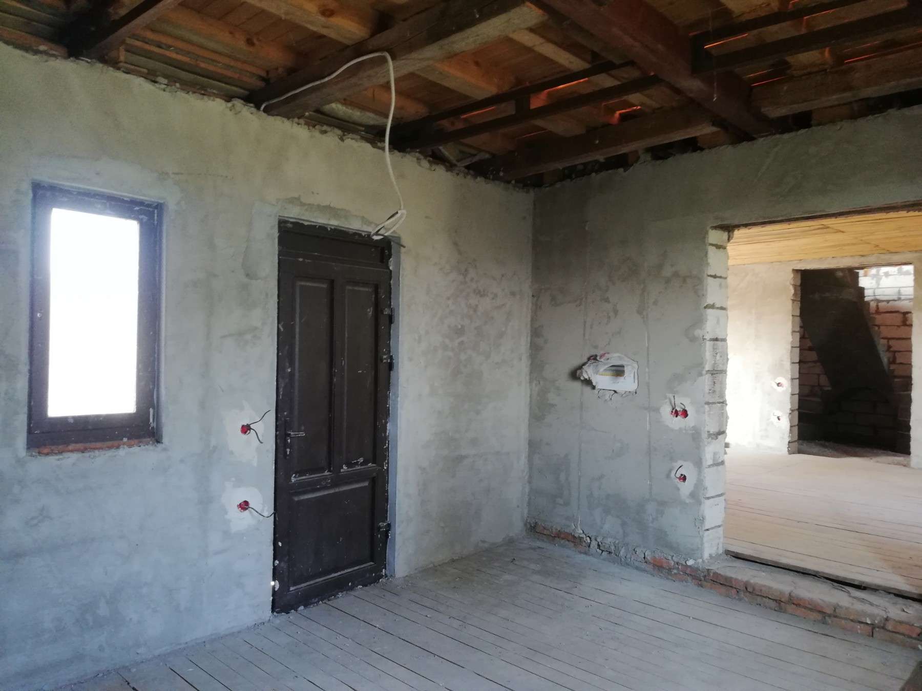 По первому этажу произведена разводка электрики. Стены – оштукатурены.