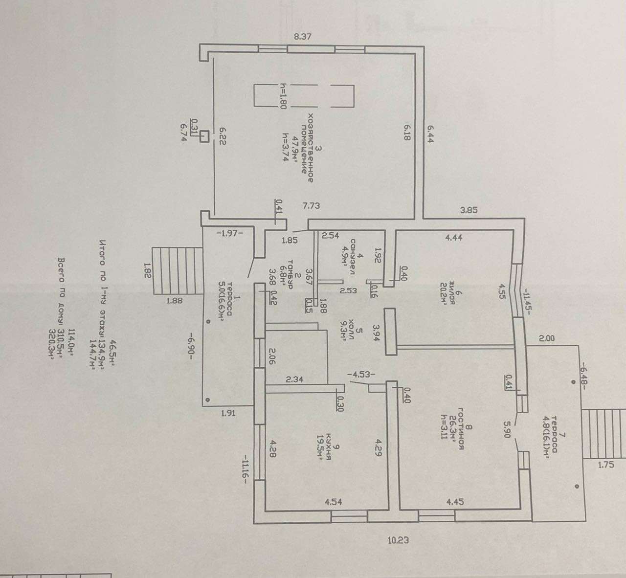 Общая площадь 310,5 кв.м, жилая-114,0 кв.м., площадь участка- 8,1 сотки (ровный, правильной геометрической формы 27*30 метров), два наземных этажа и цокольный этаж. На первом этаже- 2 изолированные жилые комнаты, кухня, санузел, второй этаж- 3 изолированные жилые комнаты, санузел.