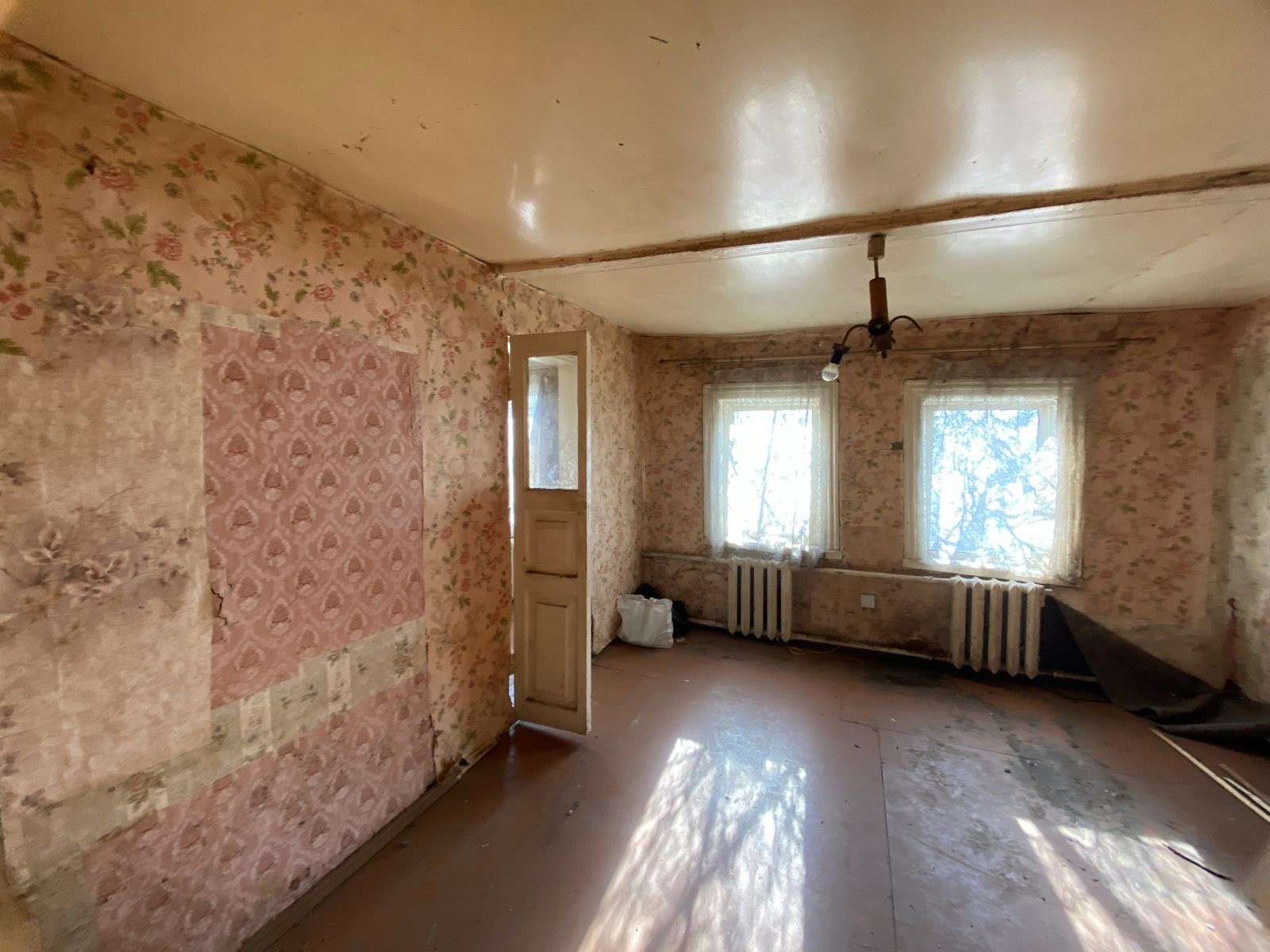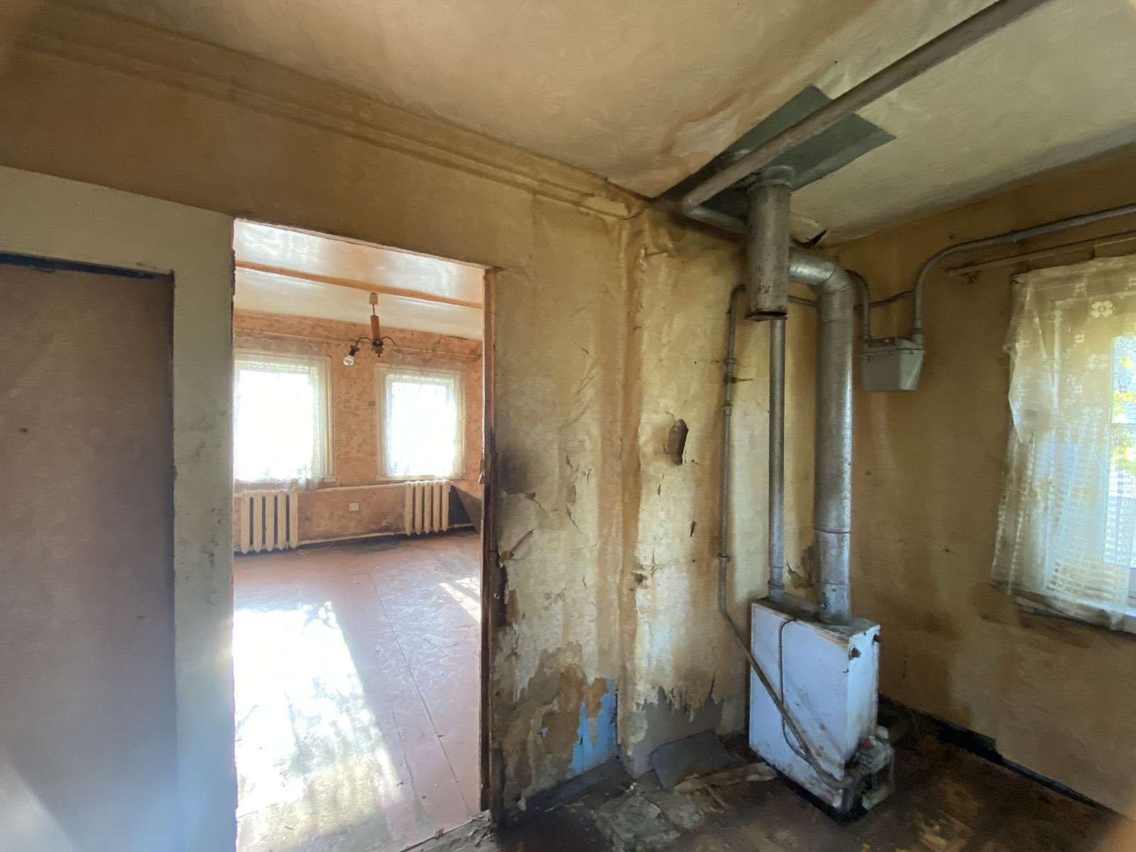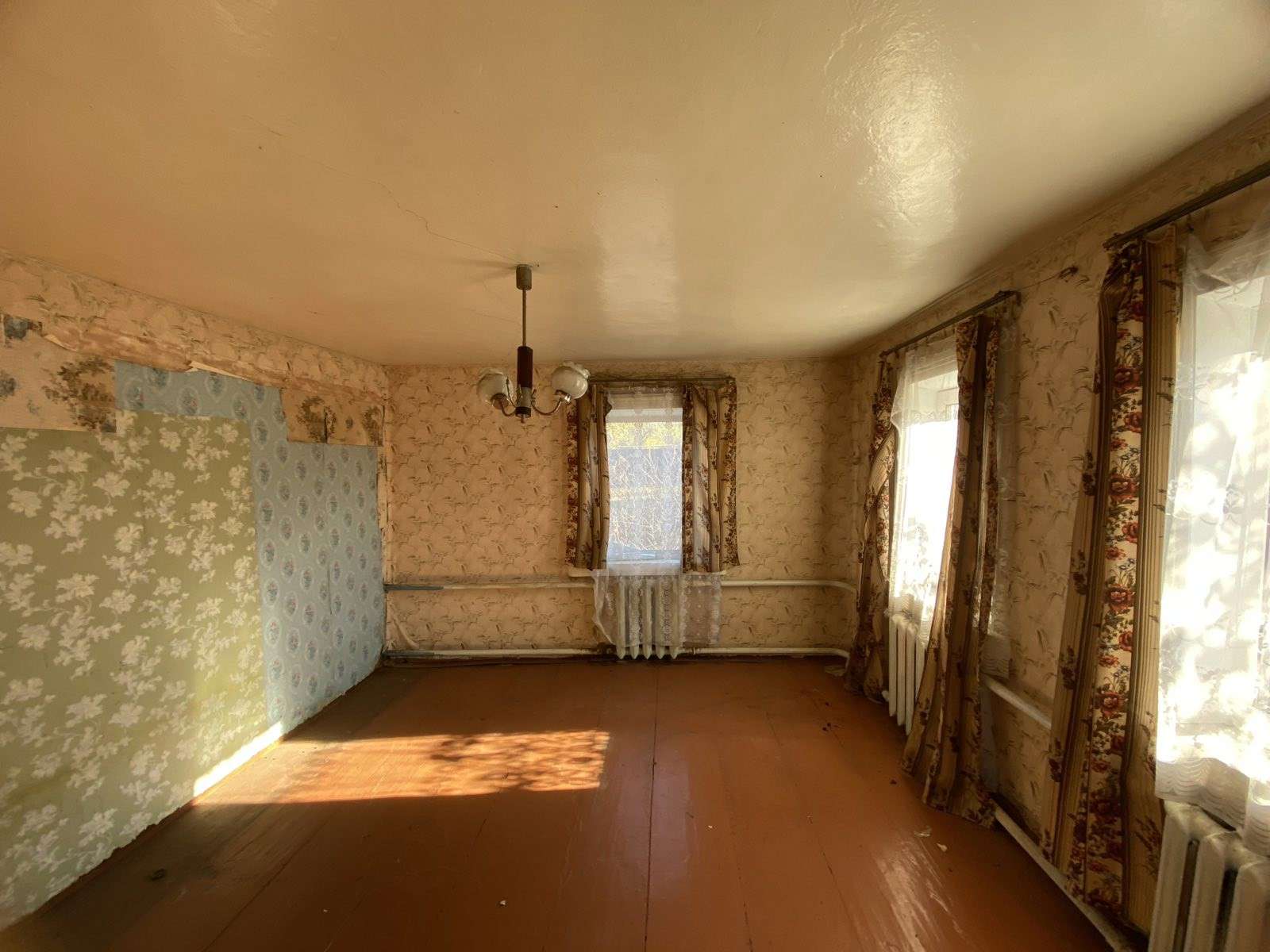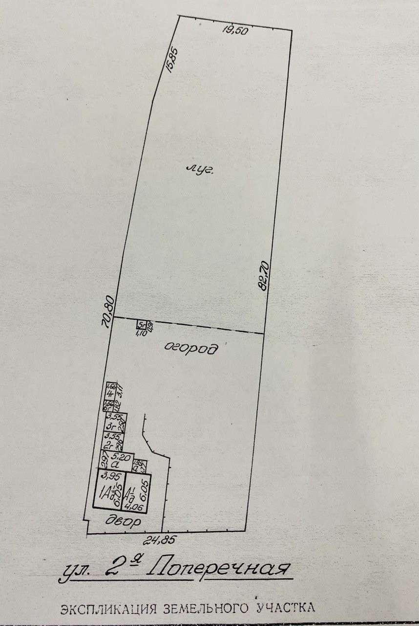 Ширина участка-24,85 метра, длина-82,7 метра. Условно разделен на огород и луг. Жилой бревенчатый дом размером 6,05*3,95 м- 1946 года, бревенчатая жилая пристройка размером 6,05*4,06 м- 1970 года, дощатые сени 5,2*2,97 м -1970 года, дощатая терраса 1,95*1,77- 1970 года, три дощатых сарая-2,96*3,55- 1986 года. Фундамент- кирпичный, крыша- шифер, окна – ПВХ. Общая площадь-41 кв., жилая-35, кв.м. Три жилых комнаты, отопление- газовый котел, су на улице. В дом заведен природный газ, электричество. Участок, относительно других жилых домов, находится на возвышенности ( не в низине).